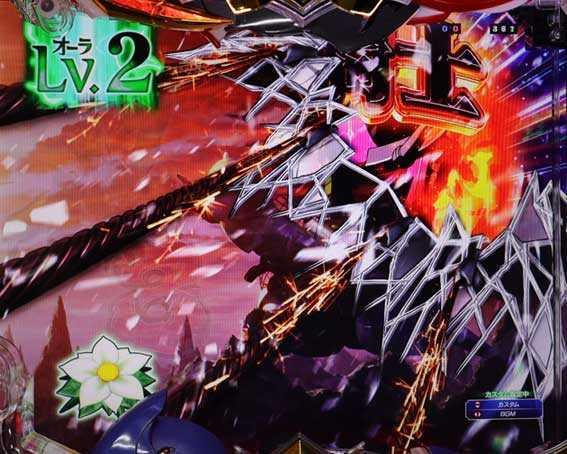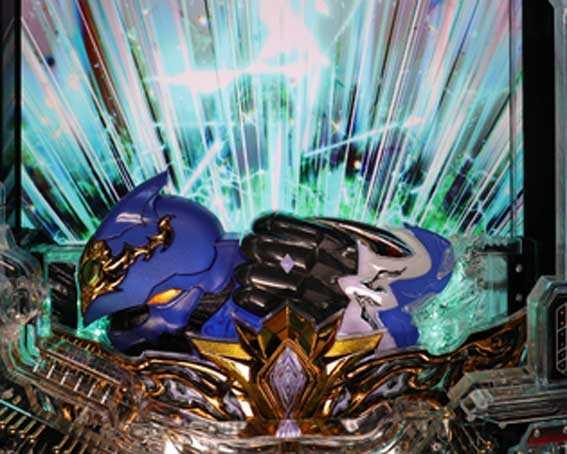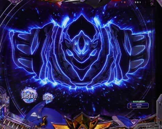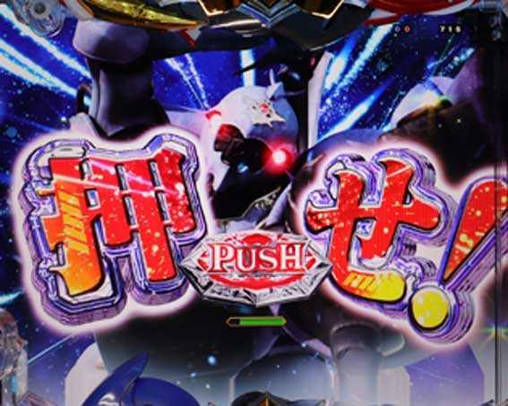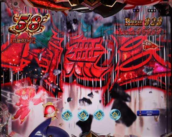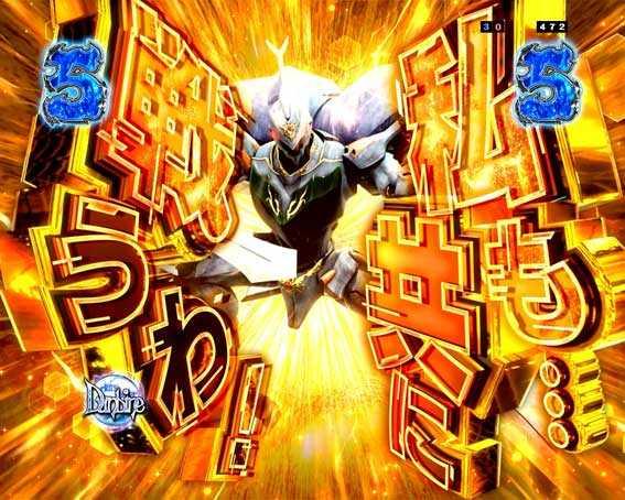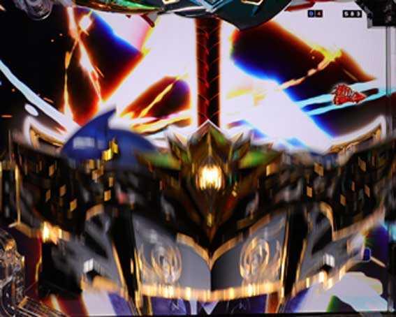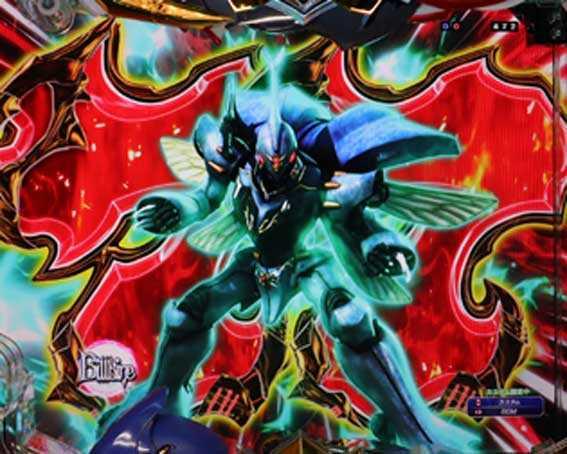 オーラバトラーが画面を踏みつぶして大当りを狙う。当落デバイスの種類に注目しよう。