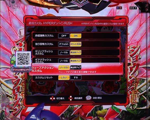 聖戦士RUSH中は赤超激熱、HYPERダンバインRUSH中は赤超激熱・当り役物・キリンフラッシュ・ギアクラッシュ・ウェーブアクションのカスタムが可能。「当り役物カスタム」はラウンド告知にすると、大当り時の役物の種類(ダンバイン:2R以上、ビルバイン:4R以上、両方:8R)でラウンド数が告知されるぞ。
