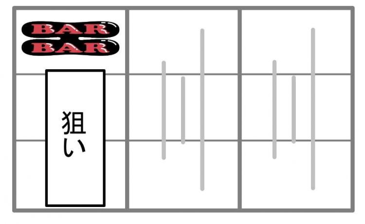 中リールBAR中段~枠2コマ下の4コマ範囲を目押しすることで、当選契機を判別することが出来ます。覚えればいい目は3つだけ!