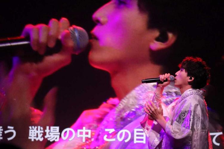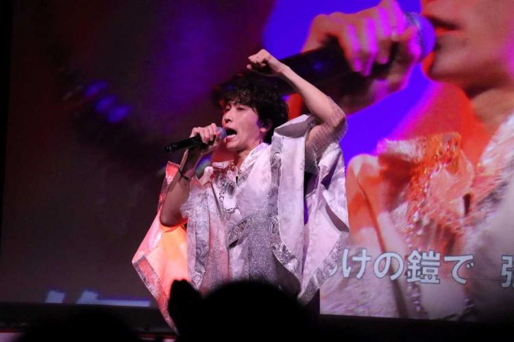 はたしてベルサール秋葉原の地下フロアにあの衣装が!? とも思いましたが、さすがに入りきらないということでそれはナシ。しかし花慶LIVEの舞台に立つのは初という貴重な場で、ベテランの貫録を見せながらチャーミングなMCと艶やかな歌声で「傾奇者恋歌」と「いくさで咲くは花の慶次」を披露しました。