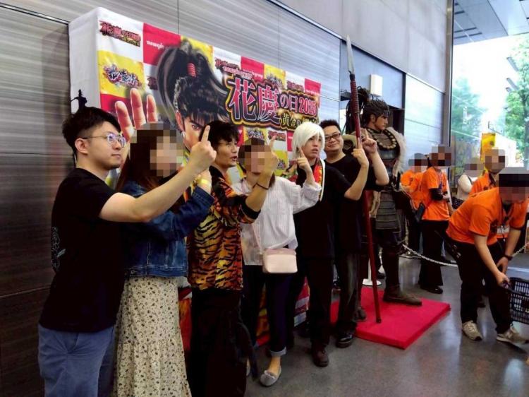 ▲前田慶次をバックにパチンコライターたちと記念撮影