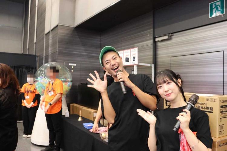 ▲スペシャルくじではパチンコライターたちもお出迎え(たなちゅうさんと原口つづくさん)