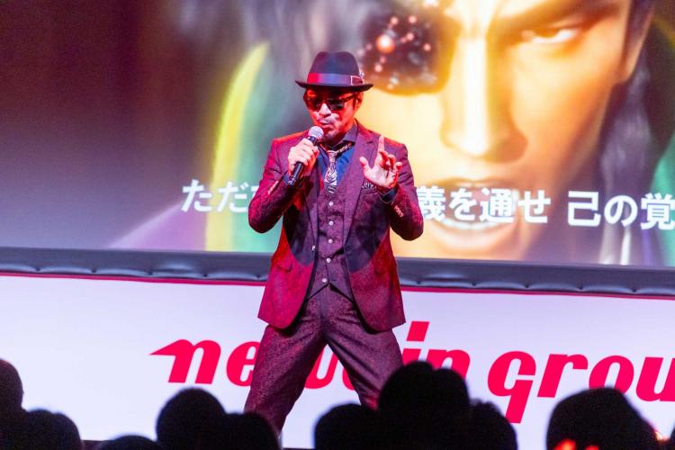 続いて登場したのは、花の慶次シリーズの主役・前田慶次のCVでおなじみの藤沢としやさん。紫のスーツにサングラスと中折れ帽が渋くキマってます。