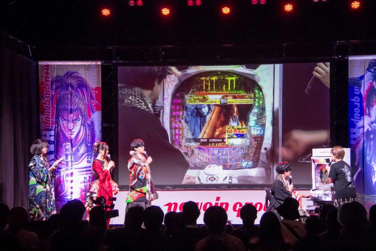また、午前と午後のライブの合間には、日直島田さん、せせりくん、ひでぴさん、ノッチさんによる『e花の慶次~黄金の一撃』最速試打LIVE配信もYouTubeで行われました。いわゆるデモ機ではなく、通常仕様の実機による4人のガチ対戦となり各配信内で視聴者たちが配信者たちを応援していました。