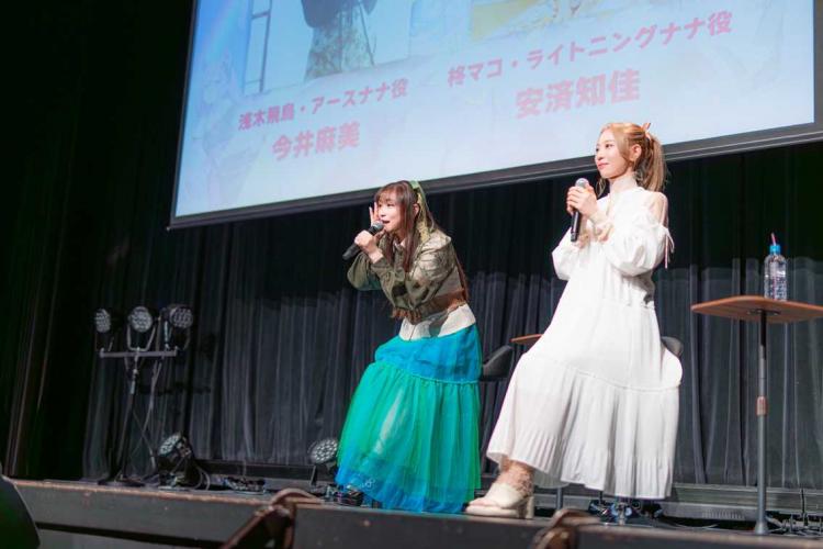 アニメ上映後は、今井麻美さん(浅木飛鳥/アースナナ役)と安済知佳さん(柊マコ/ライトニングナナ役)が登壇。それぞれ役のイメージをした衣装を着た2人が当時の思い出を語りました。