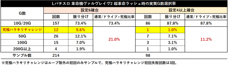超革命ラッシュ継続時のG数/ハラキリドライブ選択率