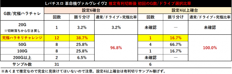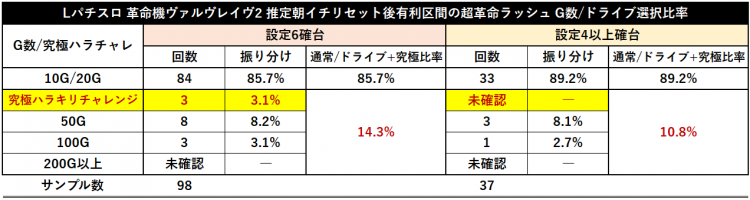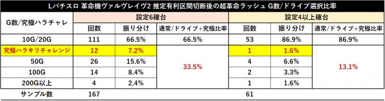 上記が推定有利区間切断後のみを抜粋した"超革命ラッシュ継続時のG数/ドライブ+究極ハラキリチャレンジ"選択比率の設定6, 設定4以上確台の実戦値となります。