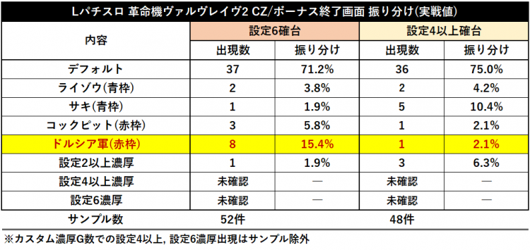 今回の実戦上では、高設定示唆(強)であるドルシア軍(赤枠)は設定6だとかなり出現していますが、おそらくこの数値は上振れ。10%前後あれば相当強いのではないかなと予想をしていますが、設定4以上止まりの台と同等くらいのサンプル数で割と開きが出ているので注目したい要素ではありそう。