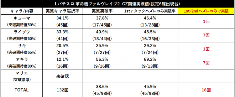 それぞれのキャラ別の実質のCZ突破率、特にサキが働いてなさすぎる気もしますが…、CZ中の挙動詳細を設定6確台でサンプルを集めてみた結果が上記の通り。