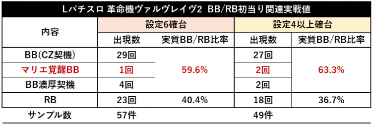上記が実際の設定6, 設定4以上確台での初当時のBB/RB比率振り分け実戦値となります。