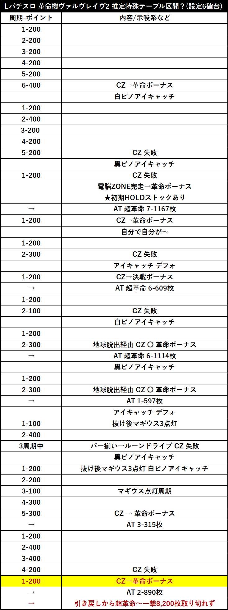 上記、設定6にて朝イチ有利区間を切断し8,000枚強出たあとにしばらくグラフ上はモミモミして停滞していた区間の実戦データを抜粋。特殊テーブルのポイント振り分けを見る限り断定をするのは難しいですが、個人的には特殊テーブルがループしていたのではないかと感じています。
