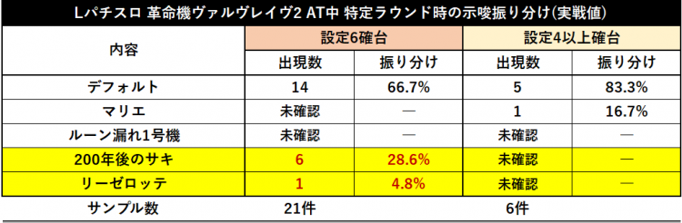 サンプル数が少ない割にかなりの頻度で"200年後のサキ"・"リーゼロッテ"が出現しているので、全台系などでは連チャンさえしてくれれば早めに違和感を察知できるかもしれません。