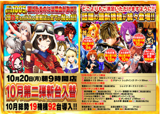 | 特徴 | 選べる4レート!! 「快適空間」×「最新システム」 新しいアミューズメントを徹底追及! 是非、nikko倉敷店にて上質の 遊技時間をお楽しみ下さいませ。 |