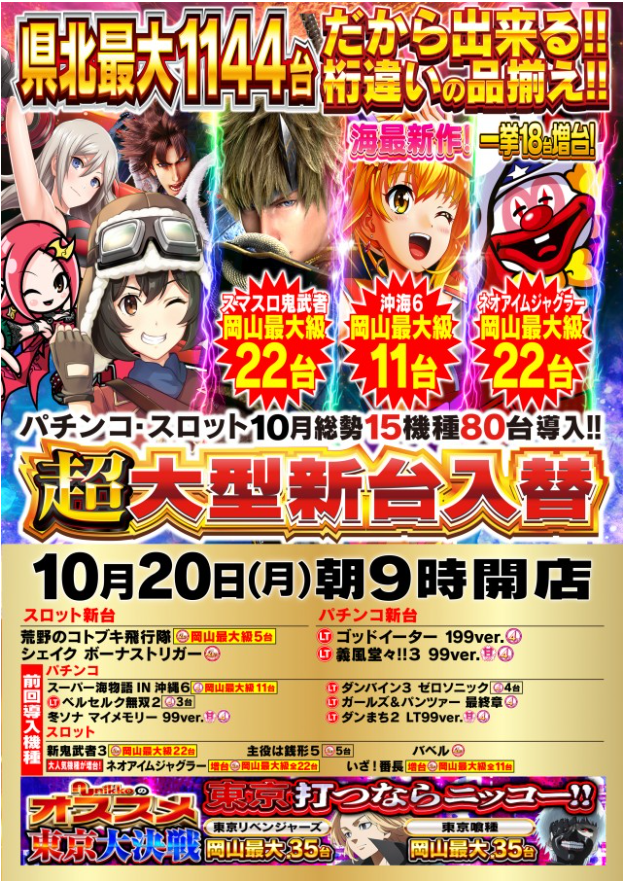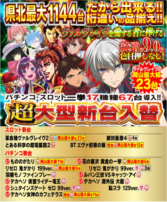 | 特徴 | ◆日本初防災特化型店舗 ◆完全コロナ対策 ◆岡山最大1144台 だから出来る 設置機種ラインナップ ◆広々とした楽々台間スペース ◆パチンコ・スロット 全台拡大計数機設置 ◆完全除菌・消臭ルーム ◆休憩ルーム コミック岡山最大数4000冊以上、 全席USBポート完備 ◆Wi₋fi完備 ◆VIP喫煙ルーム ◆マッサージコーナー ◆喫茶コーナー |