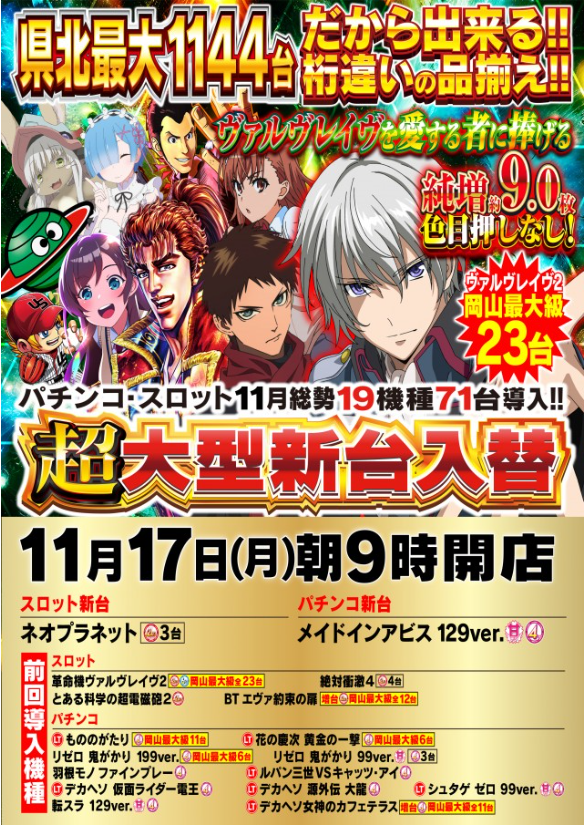 | 台数 | パチンコ616台 / パチスロ528台 |