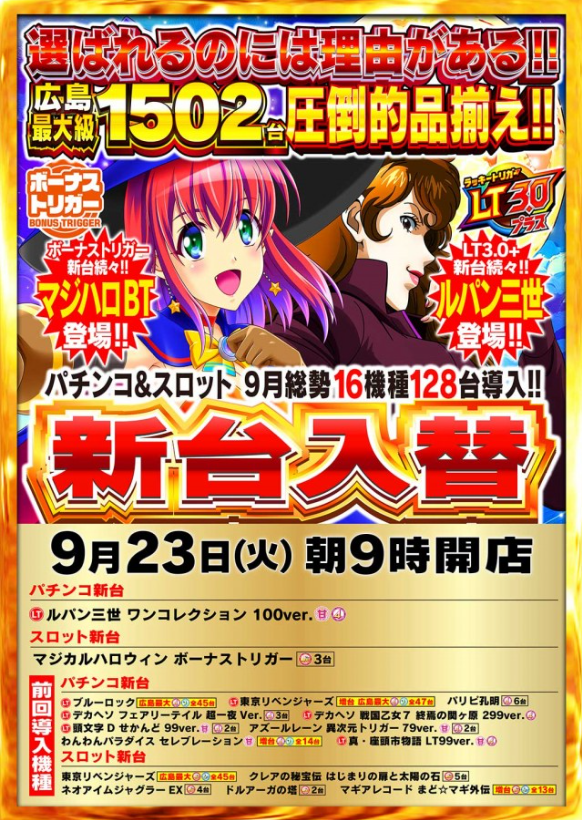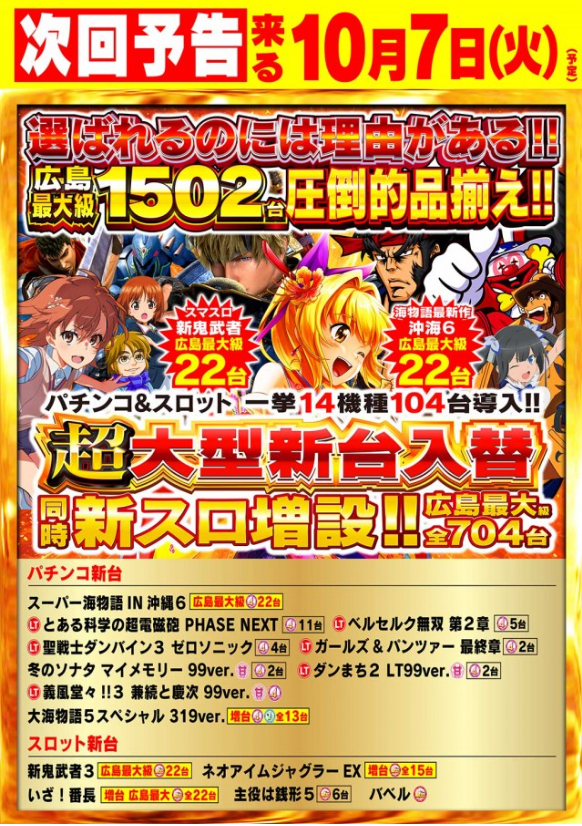 特徴 | ◆日本初防災特化型店舗 ◆広島最大1502台 だから出来る 設置機種ラインナップ ◆会員カードが超お得 【貯玉無制限】 ◆広々とした楽々台間スペース ◆パチンコ・スロット 全台拡大計数機設置 ◆完全除菌・消臭ルーム ◆完全コロナ対策 ◆休憩ルーム コミック3000冊以上、 全席USBポート完備 ◆Wi₋fi完備 ◆VIP喫煙ルーム ◆マッサージコーナー 女性専用あり ◆飲食コーナー |