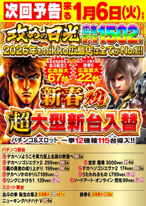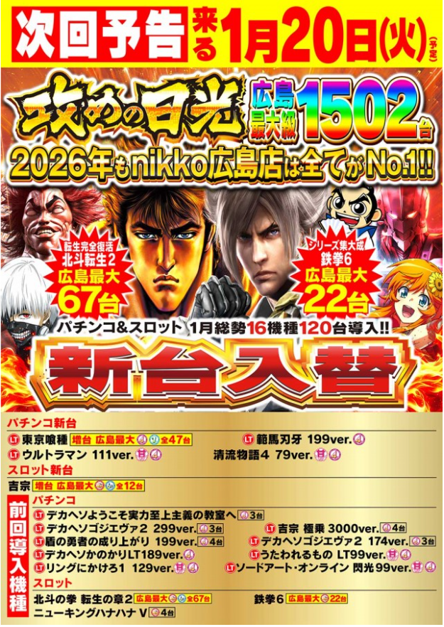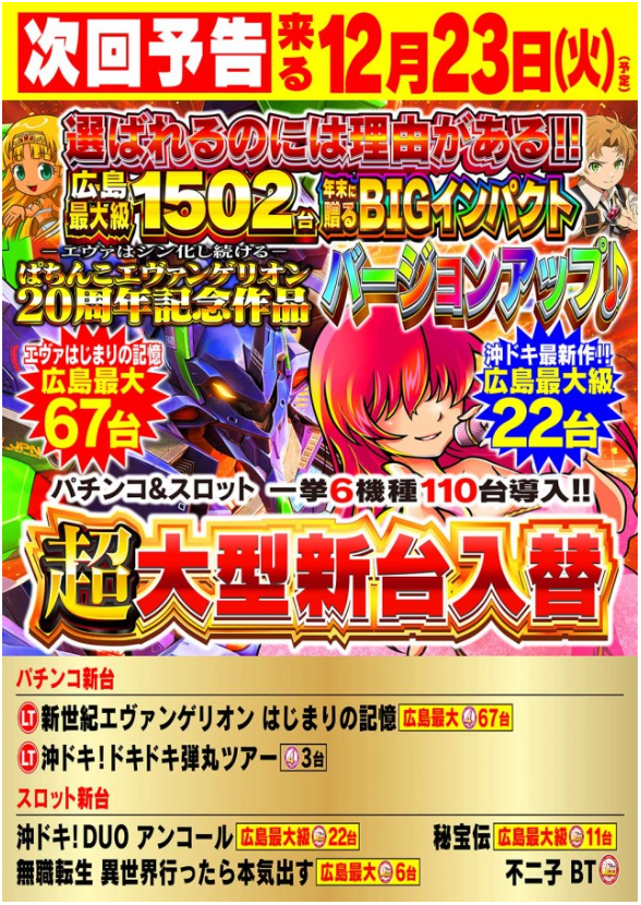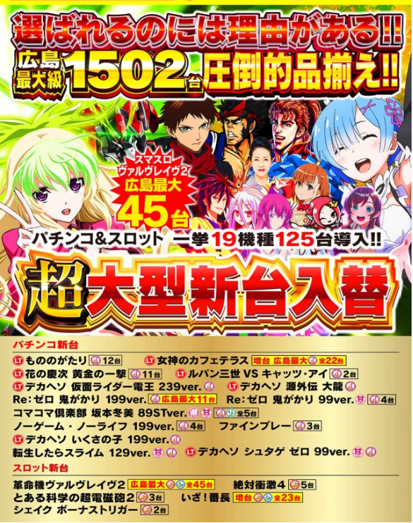 | 特徴 | ◆日本初防災特化型店舗 ◆広島最大1502台 だから出来る 設置機種ラインナップ ◆会員カードが超お得 【貯玉無制限】 ◆広々とした楽々台間スペース ◆パチンコ・スロット 全台拡大計数機設置 ◆完全除菌・消臭ルーム ◆完全コロナ対策 ◆休憩ルーム コミック3000冊以上、 全席USBポート完備 ◆Wi₋fi完備 ◆VIP喫煙ルーム ◆マッサージコーナー 女性専用あり ◆飲食コーナー |