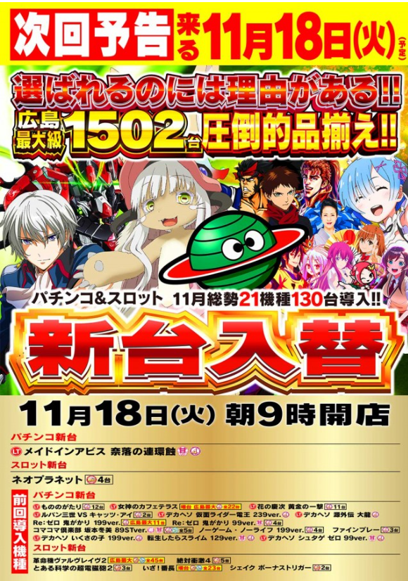 | 特徴 | ◆日本初防災特化型店舗 ◆広島最大1502台 だから出来る 設置機種ラインナップ ◆会員カードが超お得 【貯玉無制限】 ◆広々とした楽々台間スペース ◆パチンコ・スロット 全台拡大計数機設置 ◆完全除菌・消臭ルーム ◆完全コロナ対策 ◆休憩ルーム コミック3000冊以上、 全席USBポート完備 ◆Wi₋fi完備 ◆VIP喫煙ルーム ◆マッサージコーナー 女性専用あり ◆飲食コーナー |