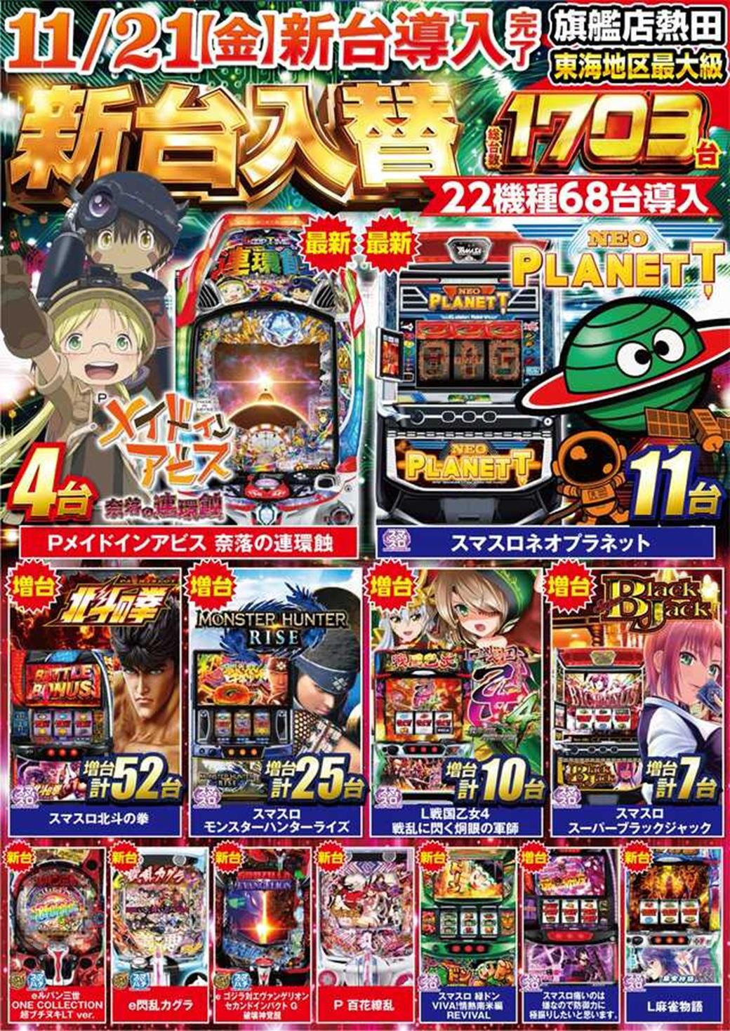| 特徴 | ◆選べる◆ ◆遊べる◆ ◆楽しめる◆ 東海地区最大級 総台数1703台!! |