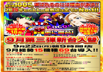 店舗 店舗情報トップ 本日の打ちいこ情報 取材 スケジュール レポート ホール取材 機種 機種情報トップ 新台カレンダー 設定判別ツール 演出信頼度まとめ 新台レポート コンテンツ コンテンツトップ 特集記事 マンガ 動画 お知らせ コミュニティログイン ログイン/会員登録 自由帳 マイページ パチポイント スロッコ パチセブントップ 本日の打ちいこ情報 打ちいこ一覧(プレミアム) 打ちいこ情報 プレミアム一覧 ALL 本日 明日 昨日 1213141516 ベニス守口店 大阪府 守口市 2025.09.22 nikko town新居浜本店 愛媛県 新居浜市 2025.09.22 nikko 真庭店 岡山県 真庭市 2025.09.22 Super nikko 愛媛県 新居浜市 2025.09.22 nikko倉敷店 岡山県 倉敷市 2025.09.22 美しが丘Nikko1000 愛媛県 新居浜市 2025.09.22 サンドラ大塚店 東京都 豊島区 2025.09.22 フォルテ 東京都 西東京市 2025.09.22 1213141516 会員登録済みの方はこちらから パスワードを忘れた方はこちら パチスロ新台情報 パチンコ新台情報