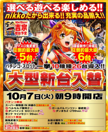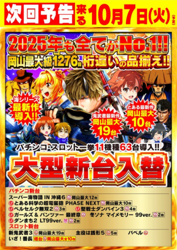 店舗 店舗情報トップ 本日の打ちいこ情報 取材 スケジュール レポート ホール取材 機種 機種情報トップ 新台カレンダー 設定判別ツール 演出信頼度まとめ 新台レポート コンテンツ コンテンツトップ 特集記事 マンガ 動画 お知らせ コミュニティログイン ログイン/会員登録 自由帳 マイページ パチポイント スロッコ パチセブントップ 本日の打ちいこ情報 打ちいこ一覧(プレミアム) 打ちいこ情報 プレミアム一覧 ALL 本日 明日 昨日 34567 ビックつばめ高崎店 群馬県 高崎市 2025.10.08 SUNSHINE MAX 千葉県 市原市 2025.10.08 nikko津山店 岡山県 津山市 2025.10.08 nikko1000+LM 広島県 三原市 2025.10.07 nikko平井店 岡山県 岡山市中区 2025.10.07 メトロ東御店 長野県 2025.10.07 グラッセ 茨城県 日立市 2025.10.07 nikko 東岡山店 岡山県 岡山市中区 2025.10.07 第一プラザ船橋店 千葉県 船橋市 2025.10.07 アミューズ吹田岸辺 大阪府 吹田市 2025.10.07 34567 会員登録済みの方はこちらから パスワードを忘れた方はこちら パチスロ新台情報 パチンコ新台情報