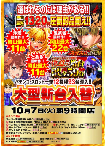 店舗 店舗情報トップ 本日の打ちいこ情報 取材 スケジュール レポート ホール取材 機種 機種情報トップ 新台カレンダー 設定判別ツール 演出信頼度まとめ 新台レポート コンテンツ コンテンツトップ 特集記事 マンガ 動画 お知らせ コミュニティログイン ログイン/会員登録 自由帳 マイページ パチポイント スロッコ パチセブントップ 本日の打ちいこ情報 打ちいこ一覧(プレミアム) 打ちいこ情報 プレミアム一覧 ALL 本日 明日 昨日 56789 ライブガーデン栃木本店 栃木県 2025.10.07 ライブガーデン幸手権現堂店 埼玉県 2025.10.07 イルサローネ東住吉店 大阪府 大阪市東住吉区 2025.10.07 メトロ東御店 長野県 2025.10.07 第一プラザ八潮店 埼玉県 八潮市 2025.10.07 nikko 泉田店 岡山県 岡山市南区 2025.10.07 第一プラザ船橋店 千葉県 船橋市 2025.10.07 まるみつ霧島店 鹿児島県 霧島市 2025.10.08 nikko 十日市店 岡山県 岡山市北区 2025.10.07 nikko R&G川東店 愛媛県 新居浜市 2025.10.06 56789 会員登録済みの方はこちらから パスワードを忘れた方はこちら パチスロ新台情報 パチンコ新台情報
