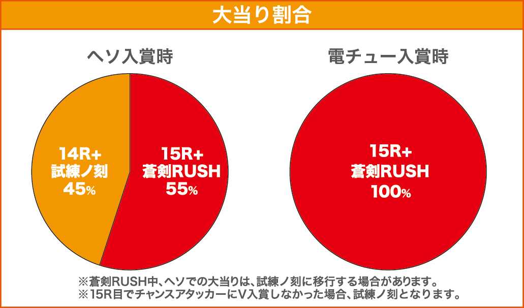 ※「蒼剣RUSH」および「試練ノ刻」中はヘソ保留で大当りした場合、14R通常の場合もあり。