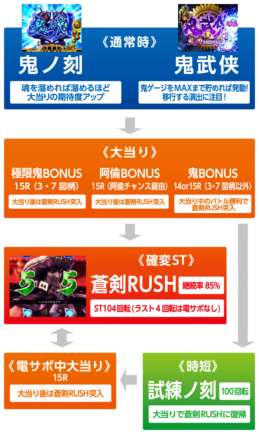 3or7図柄以外の大当り「鬼BONUS」で幻魔京バトルに敗北した場合は、100回転の時短「試練ノ刻」に突入。ここで大当りを引ければ蒼剣RUSH濃厚だ!(※)