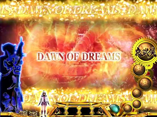 突如画面がフリーズする先読み予告。発展先のステージが重要で、駿府砦ステージならチャンス、「DAWN OF DREAMS」なら期待大!