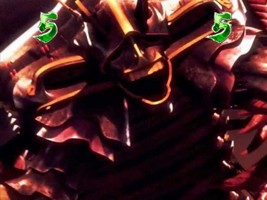 蒼鬼と高等幻魔が一騎打ち。蒼鬼の武器は、鬼刃<幻魔氷剣<轟來地冥刀<エクスカリバー(超激アツ)の順に信頼度が高まる。また、テロップが赤なら期待大!