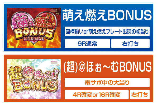 初当りは実質9R通常の「萌え燃えBONUS」。図柄揃い大当り以外に、「萌え燃え」図柄停止からも突入する。大当り後は時短の「萌え燃えじゃんけん大会モード」へ突入。