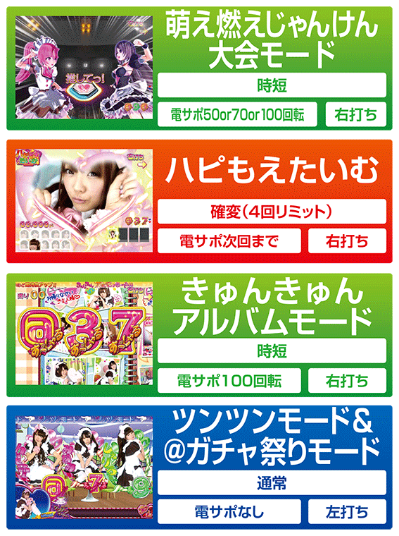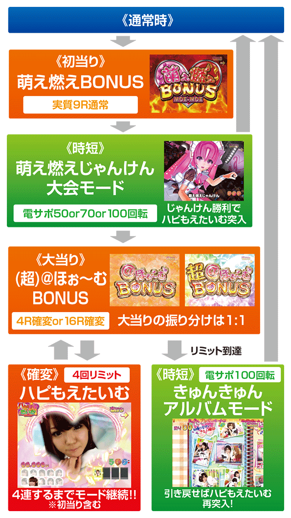 本機の初当りはすべて通常大当りで、時短の「萌え燃えじゃんけん大会モード」中に大当りを引きもどすことによってはじめて確変の「ハピもえたいむ」に突入する。「ハピもえたいむ」は4回のリミット制限があり、突入時の大当りを含めて4連チャンすると、その後は100回転時短の「きゅんきゅんアルバムモード」へ突入。時短中に大当りを引きもどせば「ハピもえたいむ」に再突入し、再び大当り4連チャンが約束される。