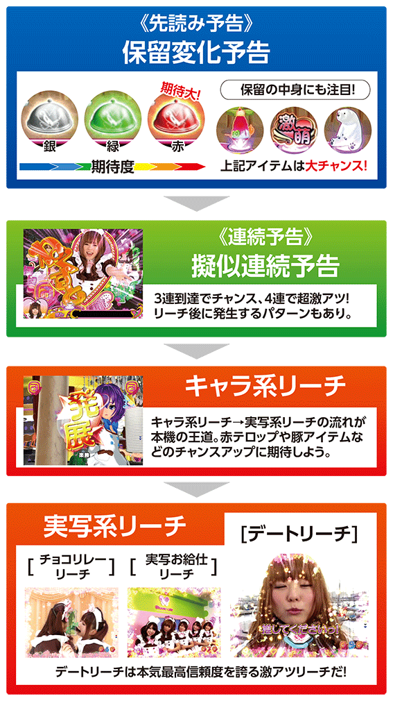 本機の大当りにつながる代表的なパターンを紹介。先読み予告やリーチ後予告、リーチ中のチャンスアップなど大当りには欠かせない重要演出をしっかりチェックしておこう!