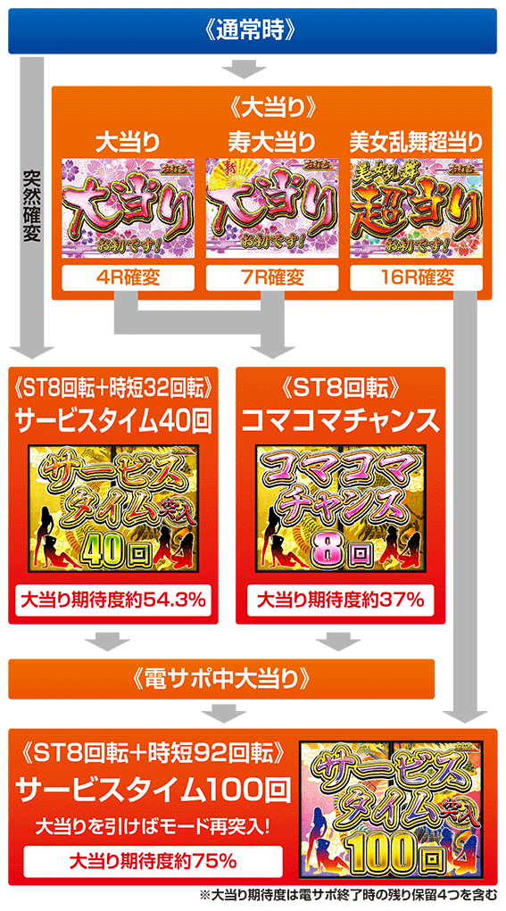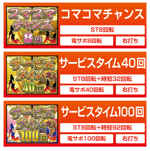 「超」以外の図柄揃い大当り後(初当り)に突入。初当りの8割が本モードへ突入する。ここで大当りを引くことができれば電サポ100回転の「サービスタイム100回」へ!!