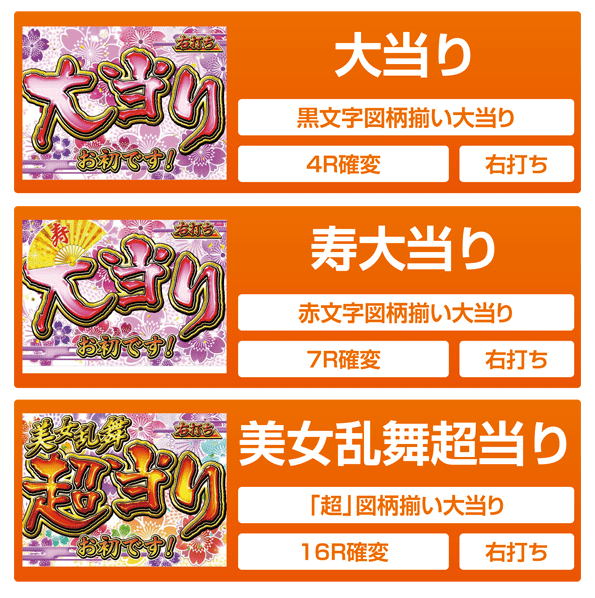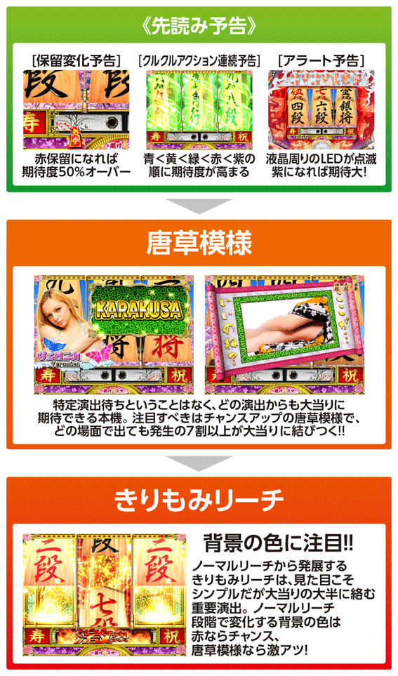 本機の大当りにつながる代表的なパターンを紹介。先読み予告やリーチ後予告、リーチ中のチャンスアップなど大当りには欠かせない重要演出をしっかりチェックしておこう!