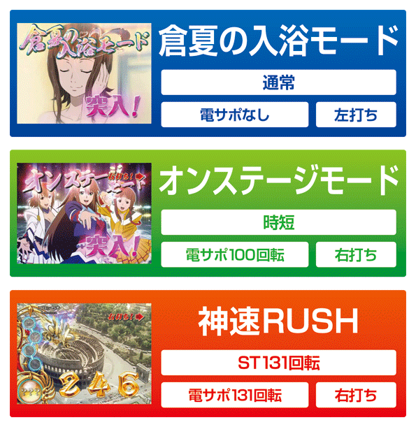 「才賀家」図柄停止後にお風呂から「倉夏」が登場すると突入。内部的には小当り当選で突入し、通常状態なのでヤメても問題ない。規定回転数を消化した後は通常モードに移行する。