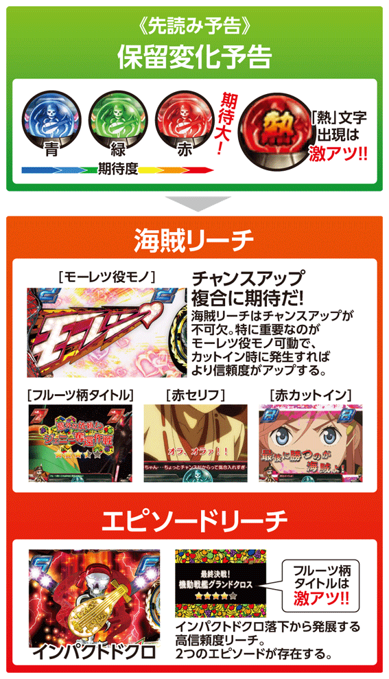 | ・名シーン予告(海賊ver.) ・金色系チャンスアップ ・アイキャッチ予告(サイドフラッシュ) |