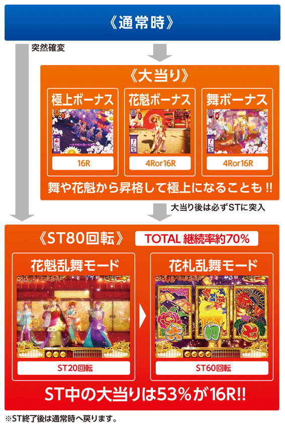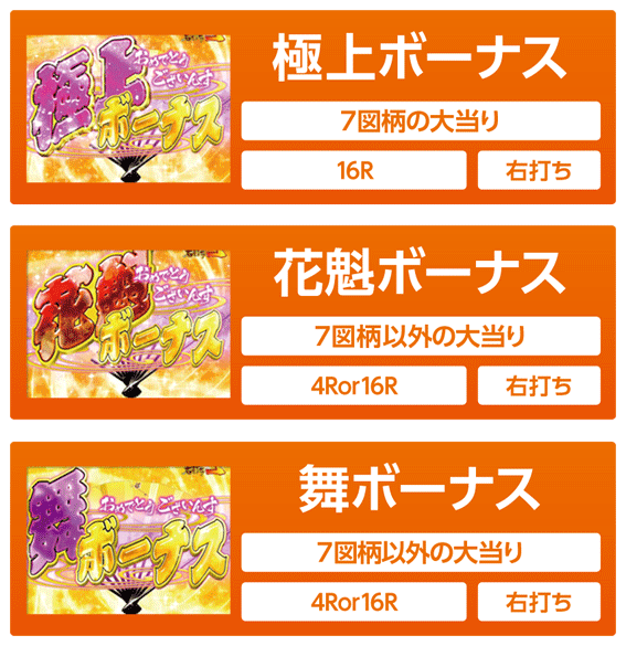 7図柄揃いの大当りと、花魁ボーナスや舞ボーナスからの昇格で突入するボーナス。16ラウンドで約2,000個の出玉の払い出しを得られる。大当り終了後はSTに突入。