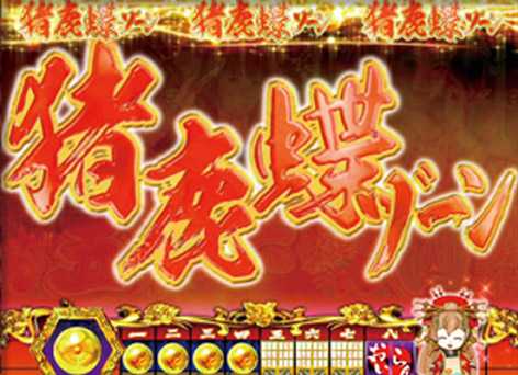 雷ゾーンや雷雨ゾーンは、こいこいゾーン突入の前兆。こいこいゾーンには月花盃ゾーン、猪鹿蝶ゾーン、五光ゾーンがあり、五光ゾーンは激アツ! (画像は猪鹿蝶ゾーン)