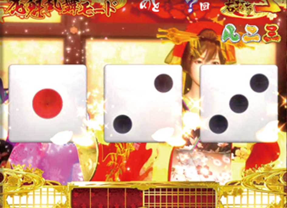 ★サイコロ連続予告は図柄がサイコロに変化して変動し、3つ揃えば大当り。ピン揃いは極上ボーナスの期待大!