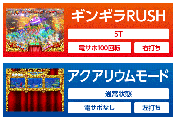 100回転継続する本機のSTモード。継続率は77.7%で電サポ中の16R大当り比率は70%となっている。1〜20回転、21〜90回転、91〜100回転の間でそれぞれ演出が変化する。なお、大当り後ギンギラRUSH非突入でも時短100回転に突入。