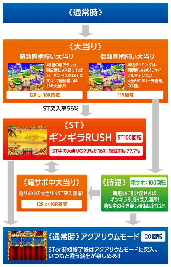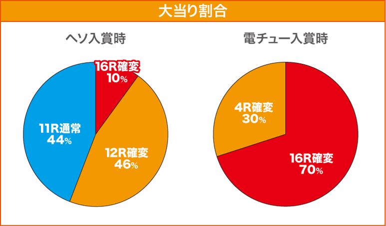| 確変突入率 | ヘソ…56%(ST100回) 電チュー…100%(ST100回) |
