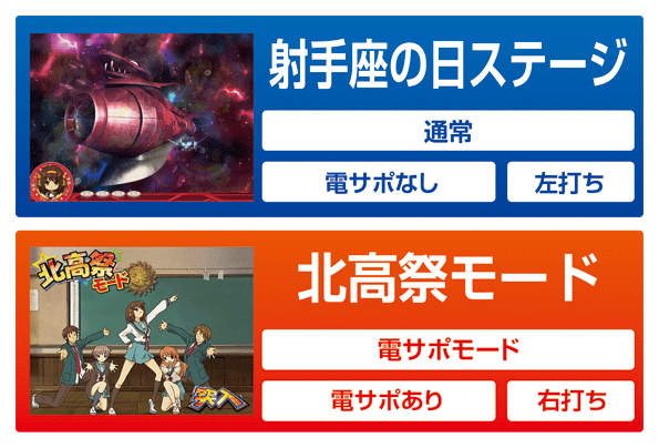 ラウンド中のSOSチャレンジに成功すれば4R大当り+北高祭モード突入、失敗した場合は8R大当りで北高祭モードには突入せず射手座の日ステージ(通常時)へ移行。