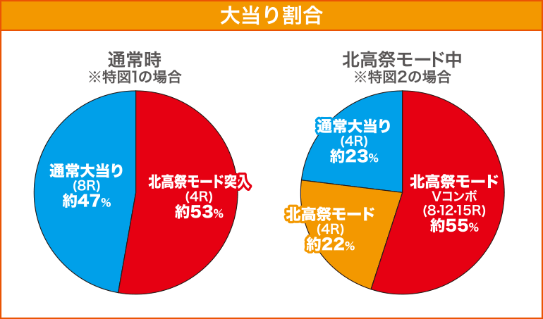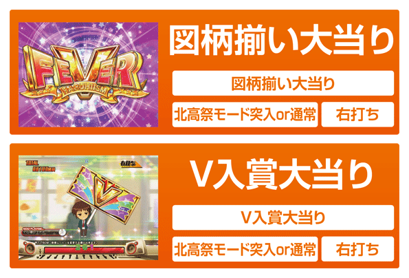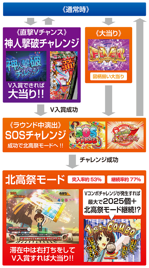 本機は図柄揃い以外にも大当りパターンが存在し、通常時に「神人撃破チャレンジ」でV入賞した場合も大当りとなる。また、北高祭モード中はV入賞大当りがメインに。