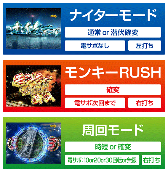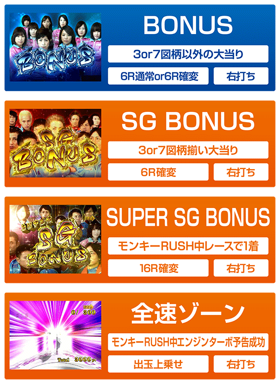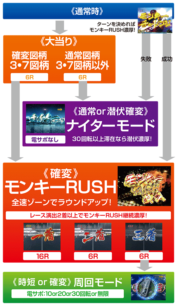 モンキーRUSH中のレース3着で突入する確変or時短モード。30回転以上滞在した場合は潜確濃厚。