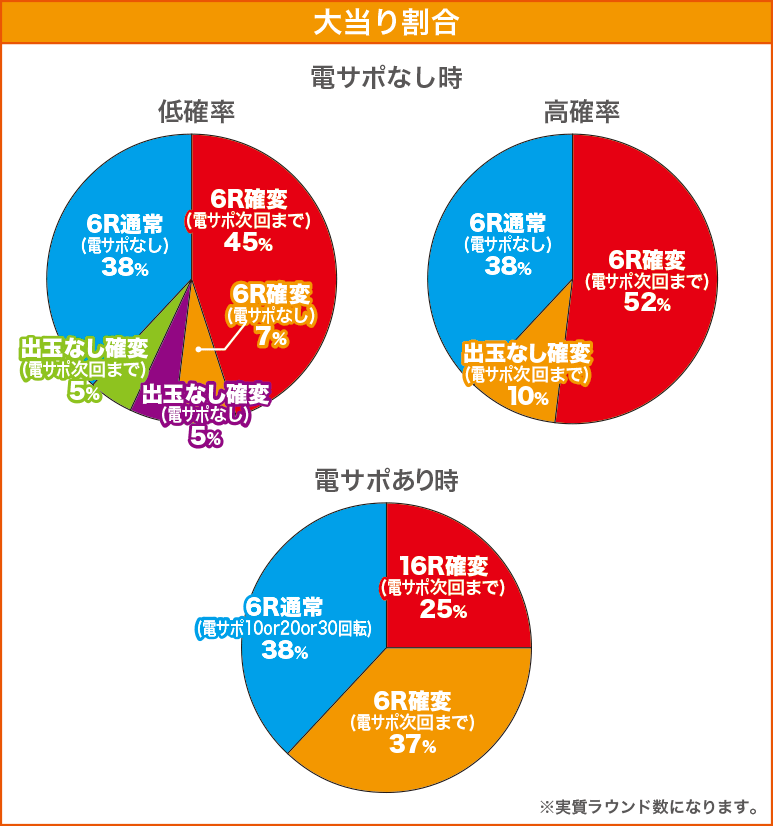 通常図柄(3•7図柄以外)揃いの6R大当り。ラウンド後はナイターモードや周回モードに突入。潜伏確変の可能性あり。