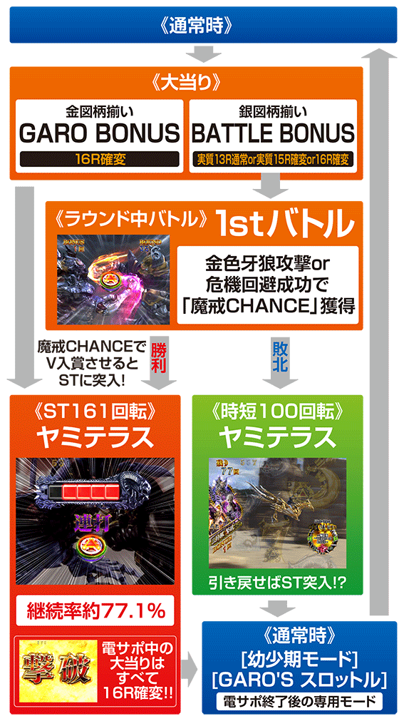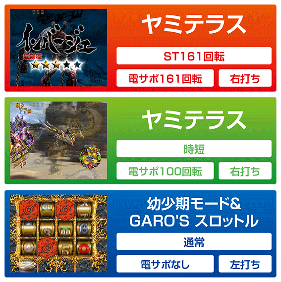 ヤミテラス終了後に突入。幼少期モード(5回転)→GARO’Sスロットルモード(25回転)と滞在し、その後は通常モードへ移行する。
