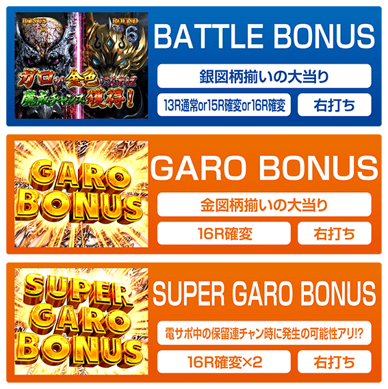 「GARO BONUS」の画面表示時に「SUPER GARO BONUS」の文字が落ちてくれば保留内連チャン濃厚! ラウンド中は専用映像が流れる。