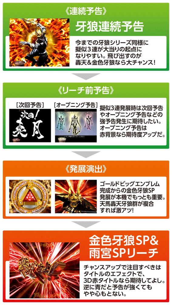 ★スーパー発展時の鎧召還演出で、ゴールドビッグエンブレムが完成すれば金色牙狼SPリーチへ発展、液晶変身の場合は漆黒牙狼SPリーチへ発展する。