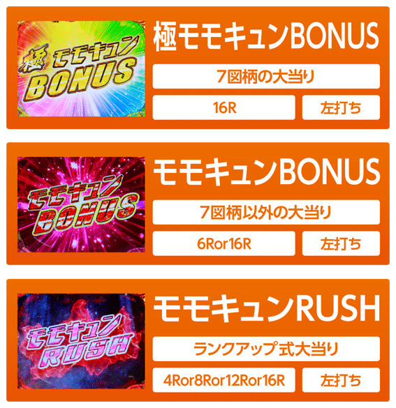 中デジタルに「モモキュンRUSH」図柄停止時や、金棒くんチャンスでV入賞すると突入する、ランクアップ式の大当り。4ラウンドごとに発生するバトルで鬼退治できればラウンドが継続。ラウンド中に発生するエフェクトは、青<黄<緑<赤の順に鬼退治期待度が高まる。